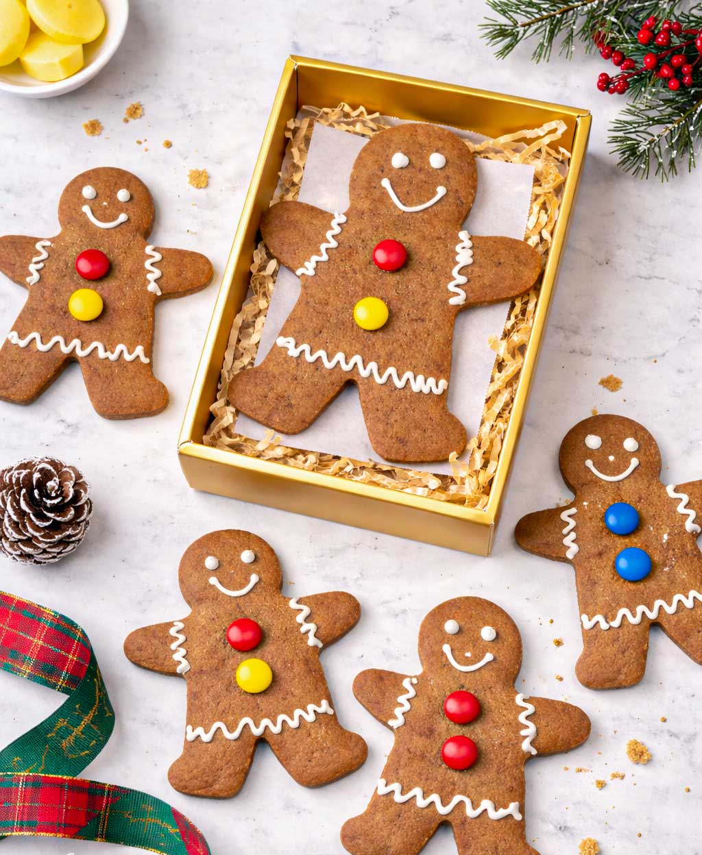 Our Gingerbread Man in a Gift box is a Large handcrafted gingerbread cookie, baked to a perfect crunch with warm festive spices and decorated with smooth vanilla icing and colourful chocolate buttons.