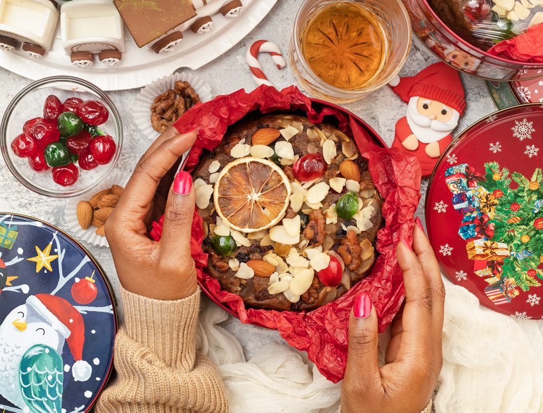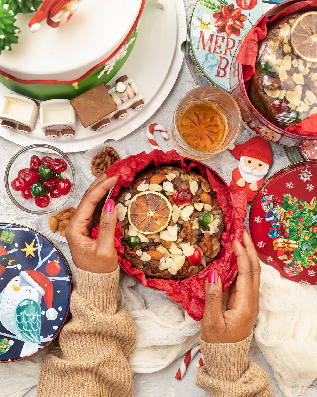 A deliciously dark 6″ Rich Fruit Cake, Rum infused, moist fruit cake made with juicy sultanas, raisins, currants, candied cherries, tangy orange, lemon and spices. Generously garnished with toasted Walnuts, Whole Almond Nuts, Almond Flakes & Oven dried Orange slices.