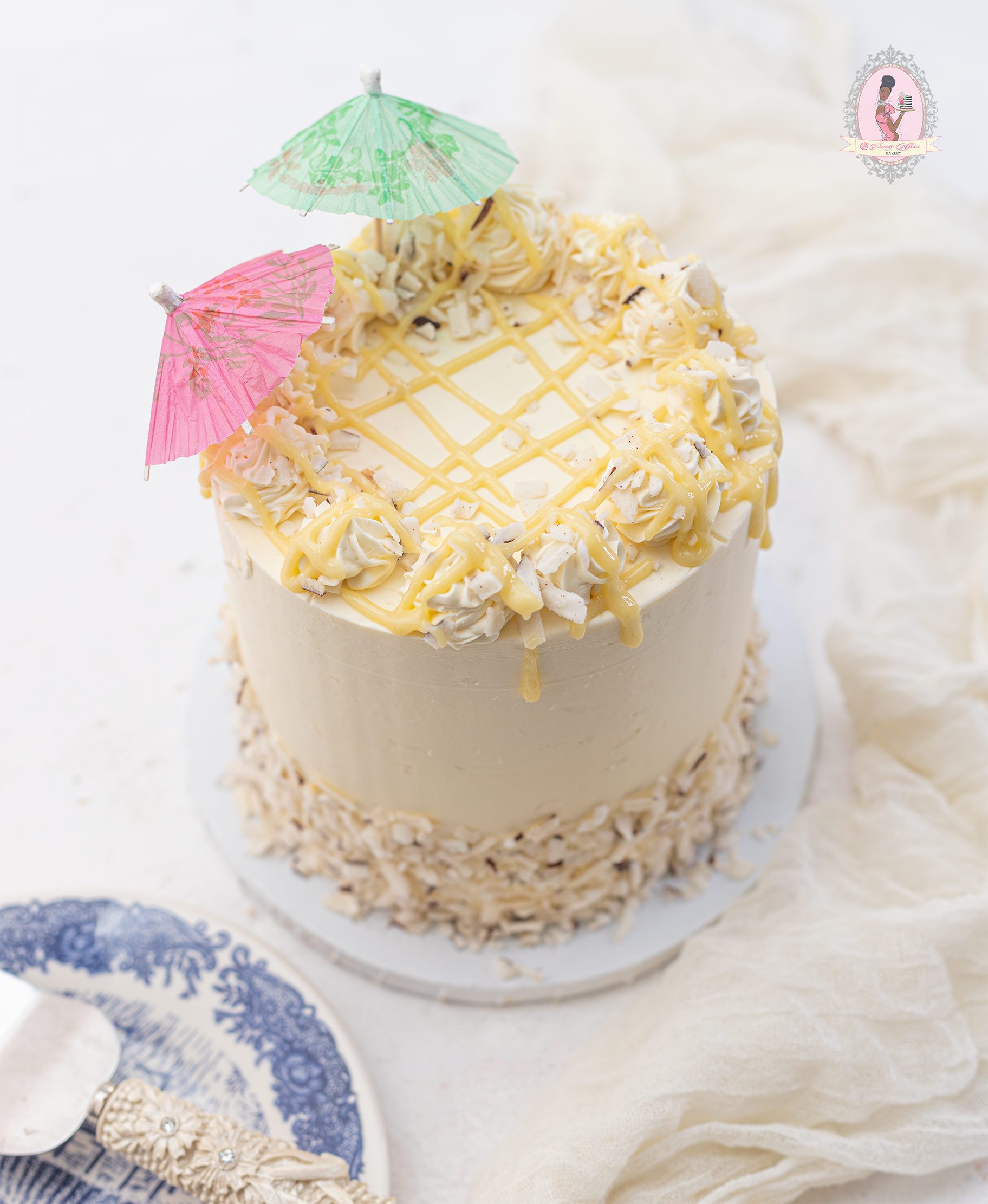 Pina-colada Cake is our super moist and fluffy layers of Hot Vanilla cake layered with swiss merigue buttercream, creamy Pina Colada curd & sweetened coconut flakes. Decorated with more Swiss meringue buttercream and coconut flakes. Truly a tropical delight.